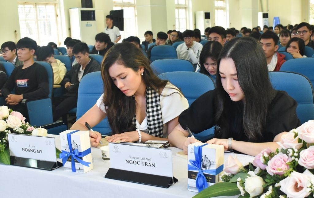 Á hậu Hoàng My và Nàng thơ xứ Huế Ngọc Trân ký tặng sách cho các bạn trẻ tham dự chương trình. Các khách mời cũng đã dành thời gian đến tham quan phòng Truyền thống của HueIC.
