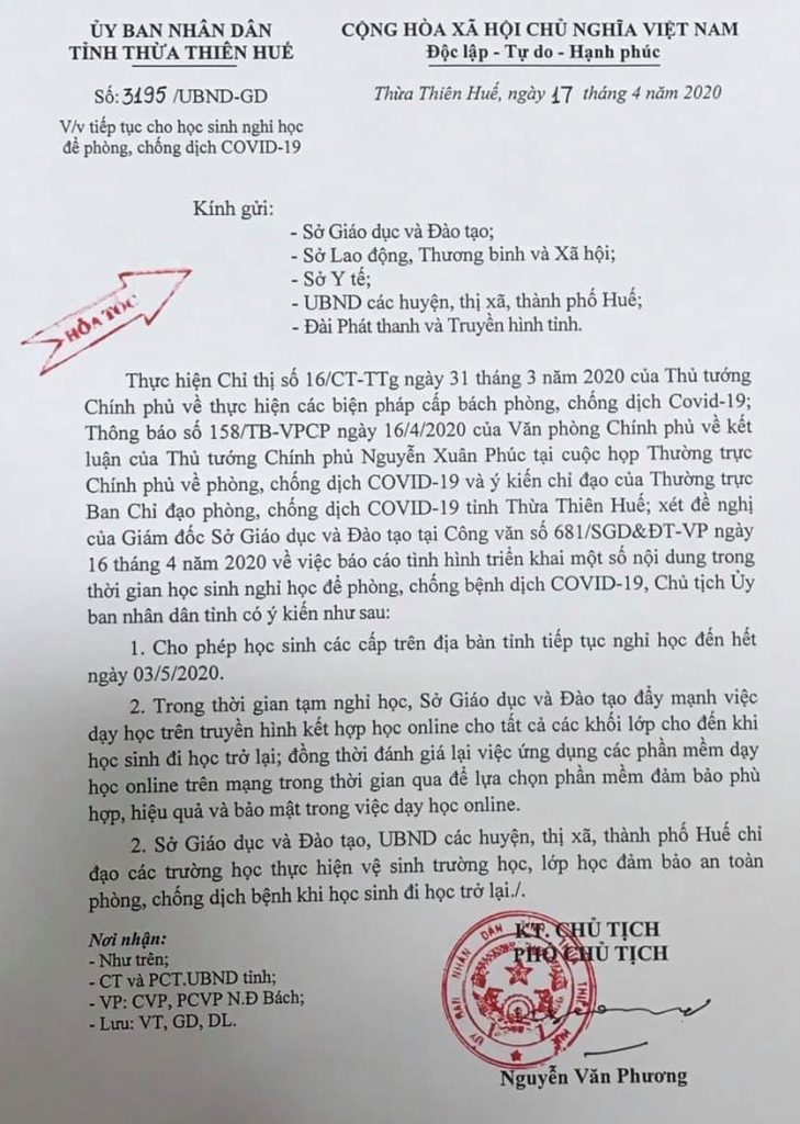 Thực hiện Chỉ thị số 16/CT-TTg ngày 31/3/2020 của Thủ tướng Chính phủ về thực hiện các biện pháp cấp bách phòng, chống dịch Covid-19; Thông báo số 158/TT-VPCP ngày 16/4/2020 của Văn phòng Chính phủ về kết luận của Thủ tướng Chính phủ tại cuộc họp Thường trực Chính phủ về phòng, chống dịch Covid-19 và ý kiến chỉ đạo của Thường trực Ban Chỉ đạo phòng, chống dịch bệnh Covid-19 tỉnh Thừa Thiên Huế, UBND tỉnh đã có Công văn số 3195/UBND-GD tiếp tục cho học sinh các cấp trên địa bàn tỉnh nghỉ học đến hết ngày 03/5/2020.