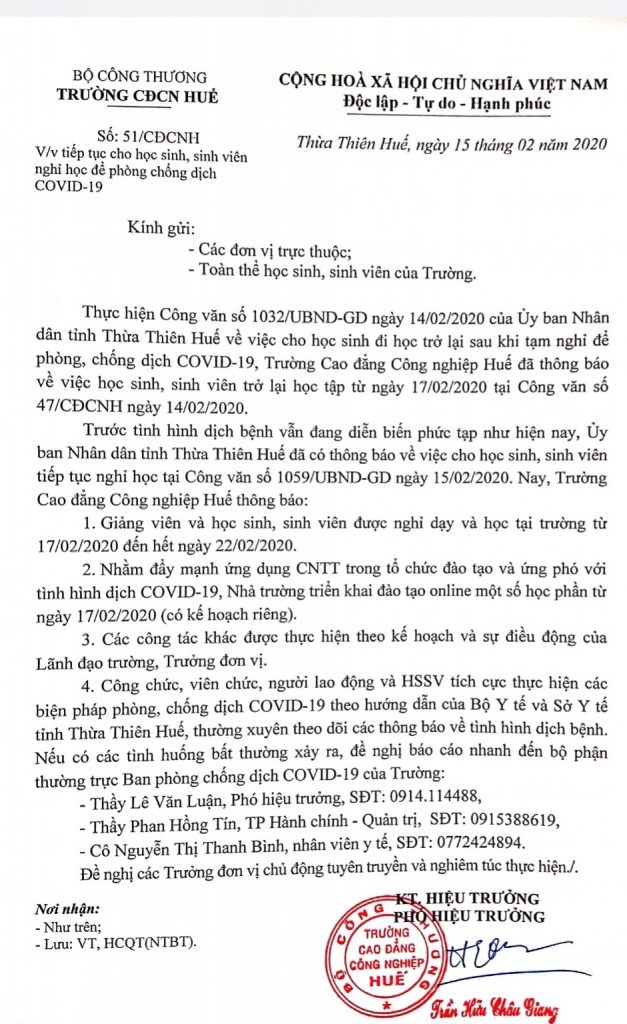 Ngày 15 tháng 02 năm 2020, Trường Cao đẳng Công nghiệp Huế (HueIC) trực thuộc Bộ Công Thương ban hành công văn số 51/CĐCNH về việc cho học sinh, sinh viên tiếp tục nghỉ học để phòng chống dịch bệnh COVID-19.