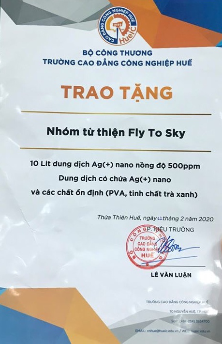 Trường Cao đẳng Công nghiệp Huế (HueIC), trực thuộc Bộ Công Thương vừa chuyển giao công thức, quy trình sản xuất dung dịch nước rửa tay khô sát khuẩn và hỗ trợ 10 lít Nano Bạc và các chất ổn định (PVA, tinh chất trà xanh) cho chiến dịch “Anh hùng diệt khuẩn” tại tỉnh Gia Lai.