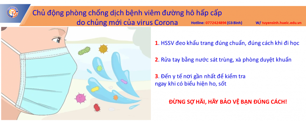 Hiệu trưởng HueIC Phạm Văn Quân vừa ký ban hành công văn số 27/CĐCNH ngày 03 tháng 02 năm 2020, theo đó, HueIC tiếp tục tăng cường triển khai các biện pháp phòng, chống dịch bệnh viêm đường hô hấp cấp do chủng mới của virus Corona, cụ thể: