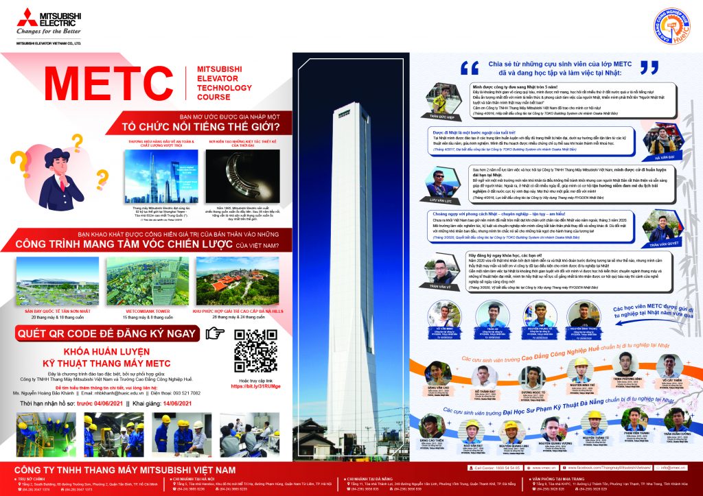 Khóa huấn luyện kỹ thuật thang máy METC 2021 được phối hợp tổ chức bởi Công ty TNHH Thang máy Mitsubishi Việt Nam (VMEC) và Trường Cao đẳng Công nghiệp Huế (HueIC), trực thuộc Bộ Công Thương.