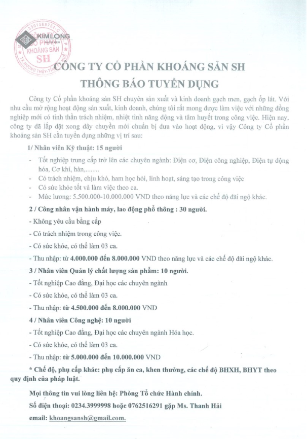 Công ty khoáng sản SH thông báo tuyển dụng: