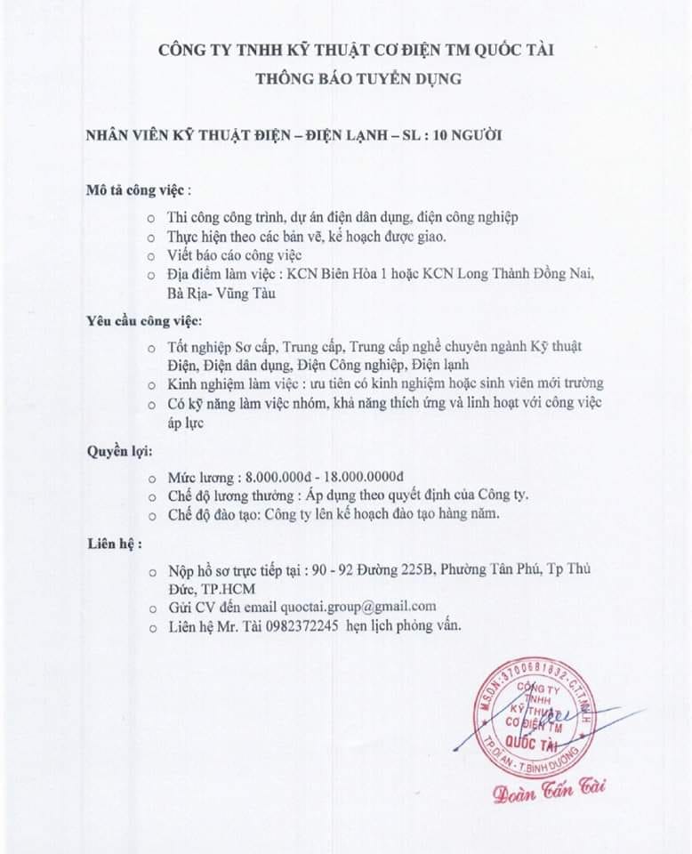 Công ty TNHH Cơ điện TM Quốc Tài tuyển dụng Công ty TNHH Cơ điện TM Quốc Tài tuyển dụng 10 nhân viên kỹ thuật Điện – Điện lạnh