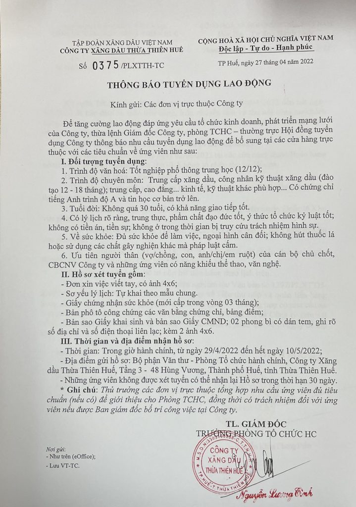 Công ty Xăng dầu Thừa Thiên Huế tuyển dụng Công ty Xăng dầu Thừa Thiên Huế tuyển dụng: Yêu cầu trình độ: Tốt nghiệp Trung cấp, Cao đẳng các ngành kinh tế, kỹ thuật
