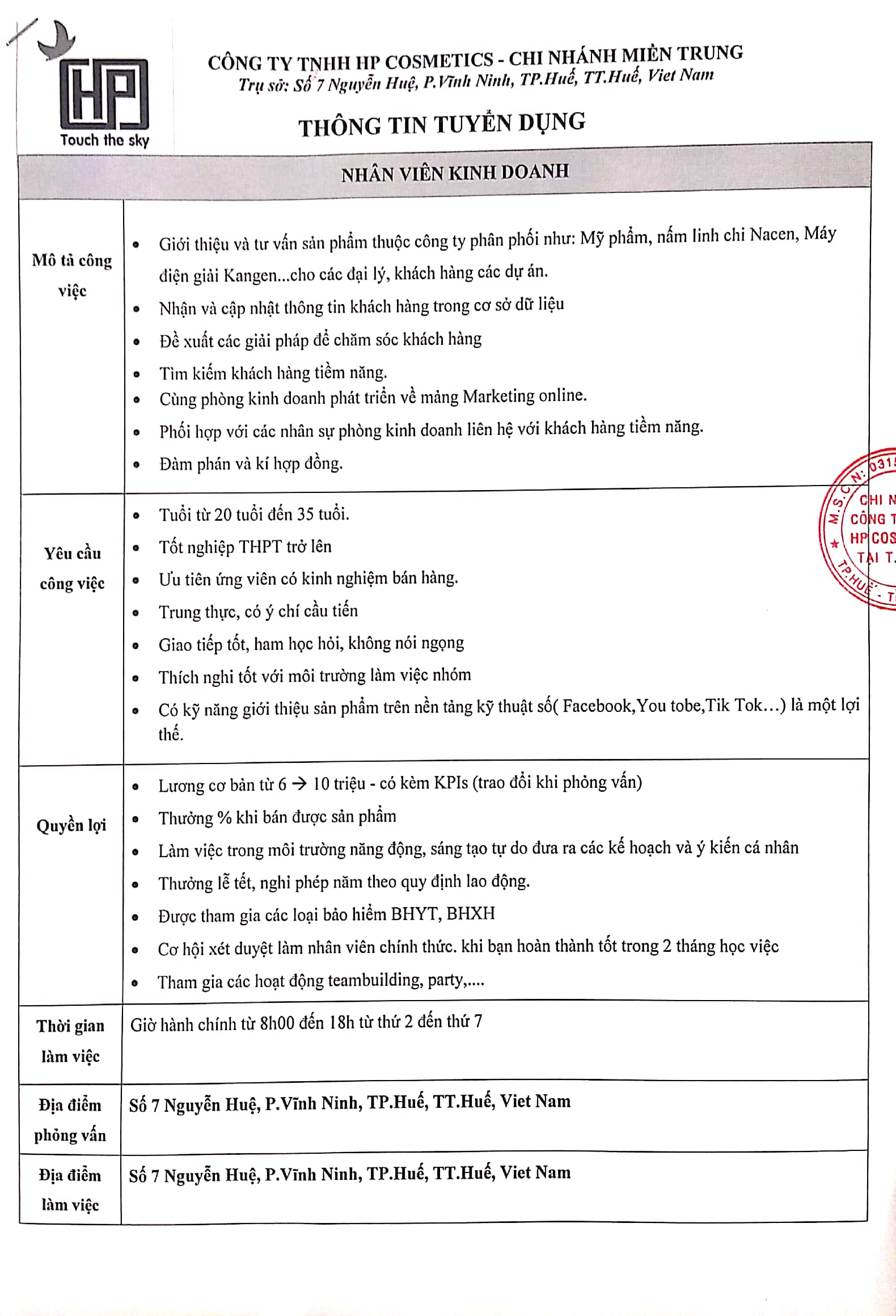 3. HP COSMTICS - Chi nhánh miền Trung tuyển dụng