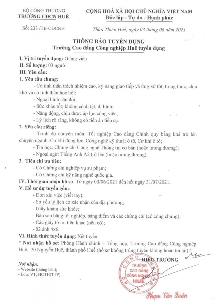 HueIC tuyển dụng giảng viên Trường Cao đẳng Công nghiệp Huế (HueIC), trực thuộc Bộ Công Thương thông báo tuyển dụng giảng viên.