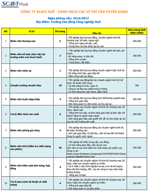 Công ty Scavi Huế công bố danh sách 103 vị trí tuyển dụng với mức lương từ US$250 đến US$600. Ngày phỏng vấn 24/6/2017, tại Cao đẳng Công nghiệp Huế.