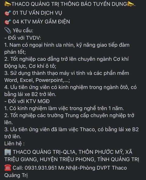Thaco Quảng Trị tuyển dụng Thaco Quảng Trị tuyển dụng —————– TRUNG TÂM TUYỂN SINH – DỊCH VỤ VÀ HỖ TRỢ SINH VIÊN, HUEIC Điện thoại: 02343837073 – 0935.561.809