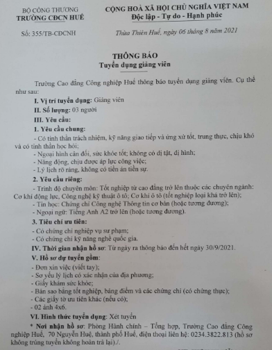 | TRƯỜNG CĐCN HUẾ TUYỂN DỤNG GIẢNG VIÊN |