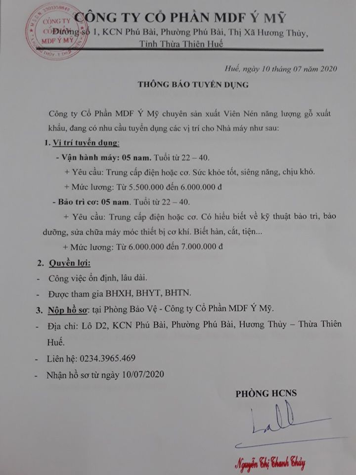 Tuyển dụng ngành Điện và Cơ khí THÔNG BÁO TUYỂN DỤNG CÔNG TY CỔ PHẦN MDF Ý MỸ Đường số 1, KCN Phú Bài – TT Huế