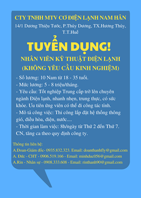 Cơ điện lạnh Nam Hân cần tuyển 10 nam nhân viên kỹ thuật điện lạnh, tốt nghiệp từ Trung cấp trở lên ngành Nhiệt lạnh. Thông tin cụ thể: